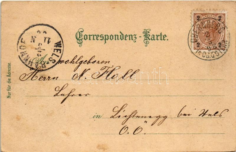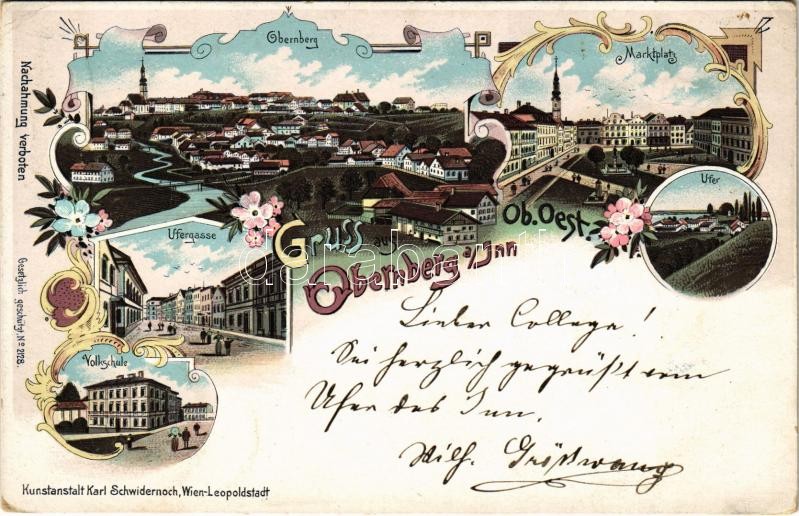1898 (Vorläufer) Obernberg am Inn, Marktplatz, Ufer, Ufergasse, Volkschule. Kunstanstalt Karl Schwidernoch No. 2128. Art Nouveau, floral, litho (EK)