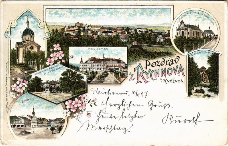 1897 (Vorläufer) Rychnov nad Kneznou, Novy zamek, Námestí, Hrbitovní kaple, Nova villa u Studánky se starym dubem, Sv. Ivan ve Vcelném, Kostel sv. Trojice a c.k. gymnasium / castle, square, school, statue. Th. Böhm Art Nouveau, floral, litho (EK)