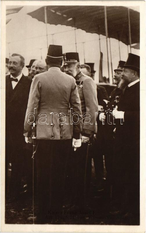 Kaiser Franz Josef I. Am Flugfeld von Wiener Neustadt / Ferenc József ... https://www.darabanth.com/en/423-Online-auction/423.0/Postcards/Emperors-Politicians-Royal-families~1500092/Kaiser-Franz-Josef-I-Am-Flugfeld-von-Wiener-Neustadt-Ferenc-Jozsef-a-becsujhelyi-repulotere~II2693797
