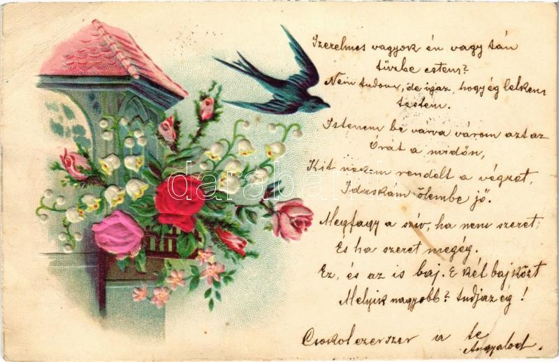 1901 Art Nouveau Emb. litho greeting card with silk flowers (EB)