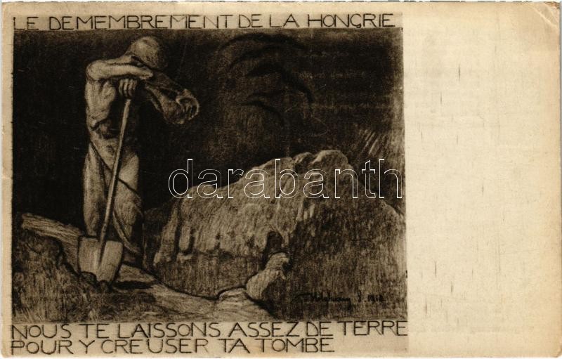 Description: Magyarország földarabolása ciklus II. képe: "Csak annyi földet hagyunk neked, ahol a sírodat megáshatod" Kiadja Magyarország Területi Épségének Védelmi Ligája / The Dismemberment of Hungary "Just enough earth left where to dig your grave" Hungarian irredenta propaganda, Trianon s: Unghváry Sándor (EK)