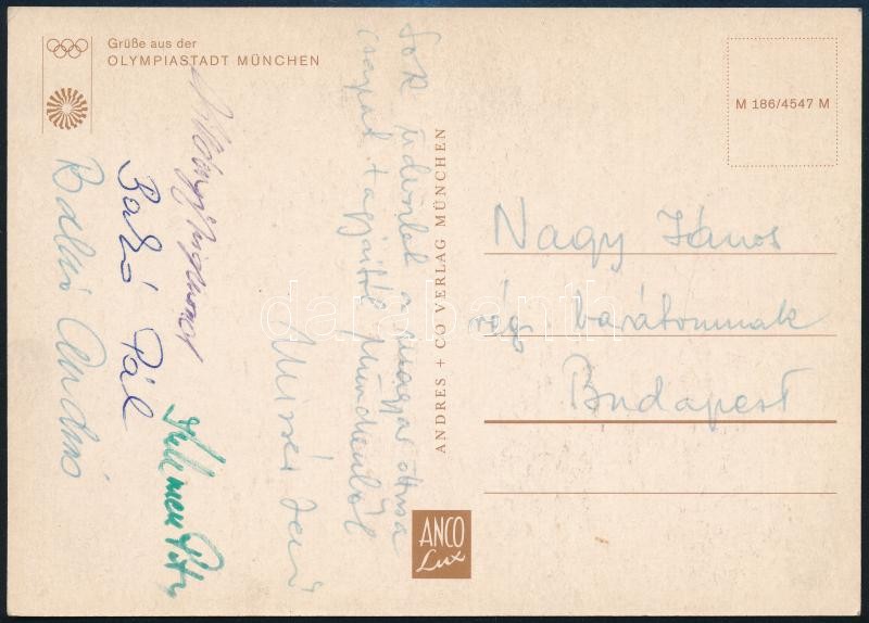 1976 A magyar öttusa csapat tagjai Mizsér Jenő. Villáni Zsigmond, Balczó Attila, Kelemen Péter, Bakó Pál által aláírt képeslap a Műncheni Olimpiáról