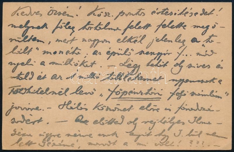 Description: 1925 Ismeretlen családtag által Széchényi Viktornak (1871-1945), Fejér megyei főispánnak küldött levelezőlap szeszgyár építésére kölcsönadott pénz tárgyában