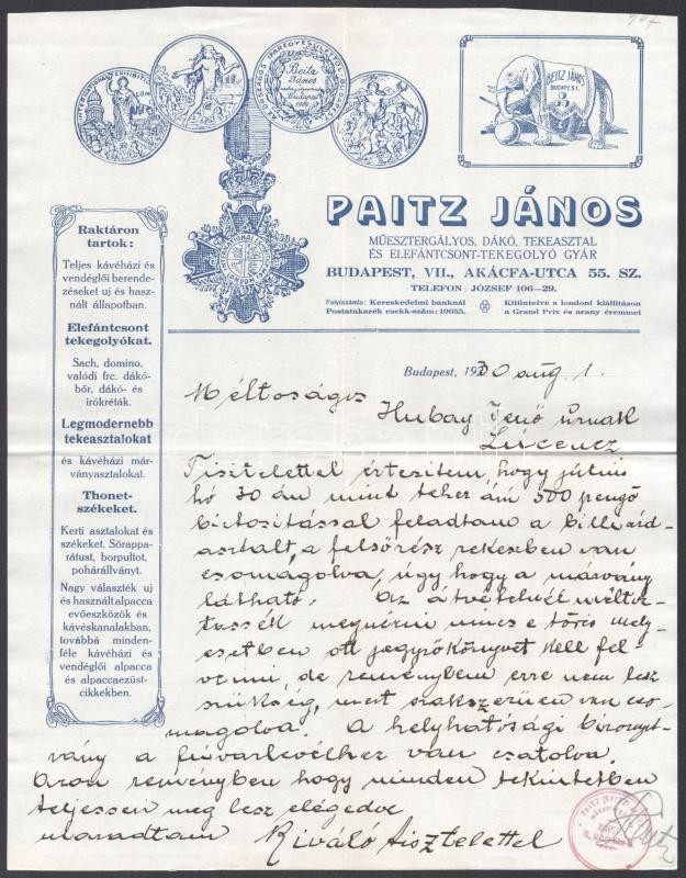 1930 Bp., Paitz János műesztergályos, dákó, tekeasztal és elefántcsont-tekegolyó kereskedÅ‘ saját kezű levele Hubay JenÅ‘ (1858-1937) hegedűművész, zeneszerzÅ‘ részére, amelyben értesÃti, hogy feladta számára az általa megrendelt biliárdasztalt. DÃszes, fejléces levélpapÃron, aláÃrással, bélyegzÅ‘vel.