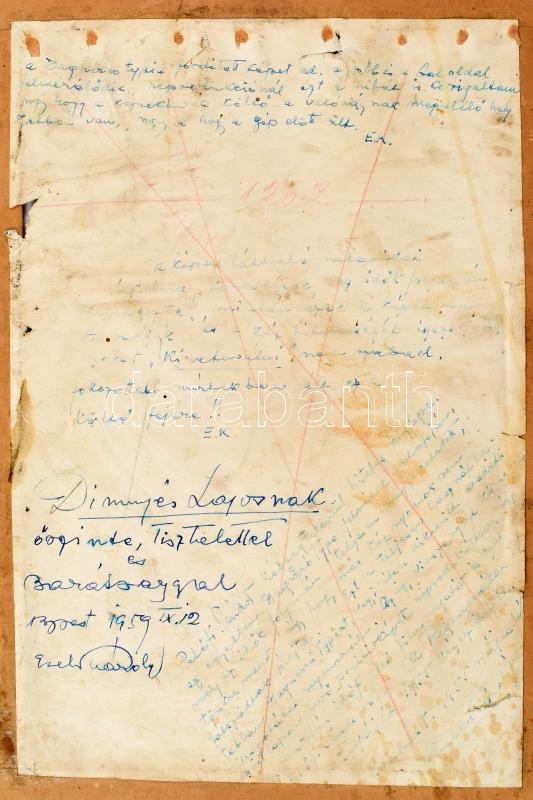 1959 Bp., Escher Károly (1890-1966) fényképész, fotóriporter autográf aláÃrása és sorai Dinnyés Lajos (1901-1961) politikus, országgyűlési képviselÅ‘, miniszterelnök (1947-1948) részére, a PetÅ‘fi-dagerrotÃpiáról (az egyetlen PetÅ‘fi Sándor alakjáról fennmaradt fénykép) készÃtett felvétele hátoldalán. Karton keretre ragasztva, sérülésekkel, hátoldalán foltokkal, 28,5x19 cm