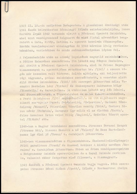 1971 Rátonyi Róbert (1923-1992) színművész autográf aláírással ellátott önéletrajza 3 gépelt oldalon valamint színházi adatlapja
