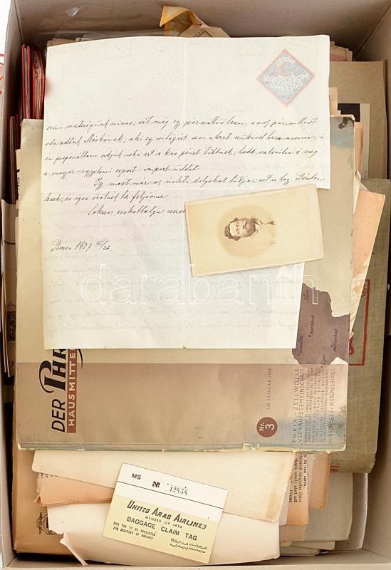 Nagy doboznyi vegyes papírrégiség tétel. Rendkívül változatos: reklámok, nyomtatványok, régi levelek, igazolványok, fotók, érdemes megnézni.