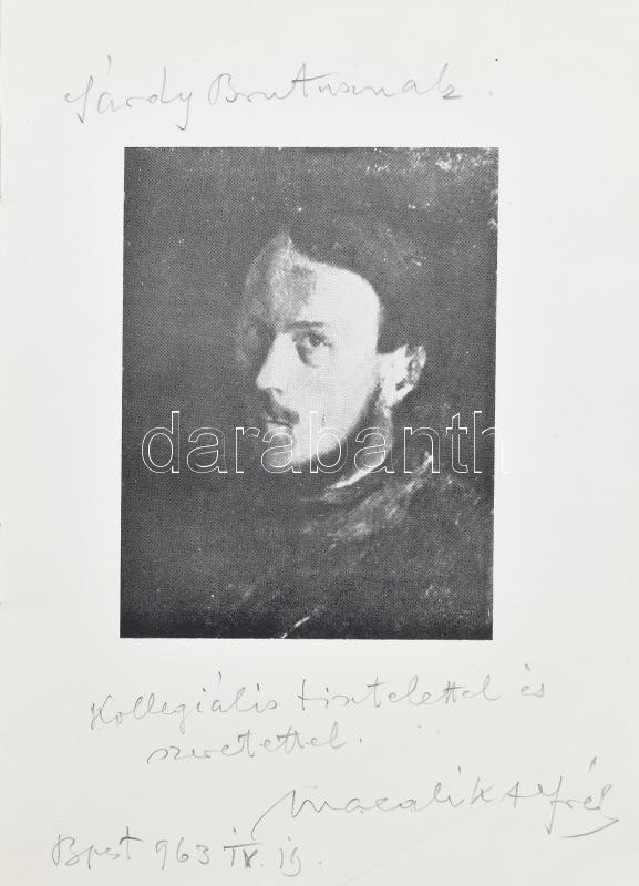 Description: Macalik Alfréd festőművész 50. évi retrospektív-jubiláris képkiállítása. Macalik Alfréd (1888-1979) által Sárdy Brutus (1892-1970) festőművész, restaurátor, a Magyar Nemzeti Galéria Restaurátori Osztályának vezetője részére dedikált példány. Nagyvárad, 1961, k.n. Magyar és román nyelvű kiállítási katalógus. Kiadói papírkötés.