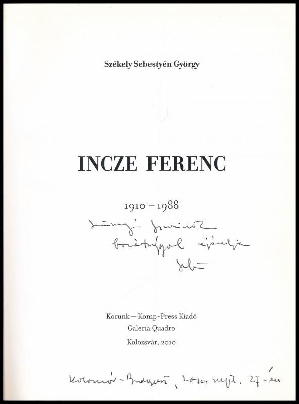 Székely Sebestyén György: Incze Ferenc. 1910-1988. A szerző, Székely Sebestyén György (1978-) által Sümegi György (1947-) művészettörténésznek DEDIKÁLT példány! Kolozsvár, 2010., Korunk - Komp Press - Galeria Quadro.