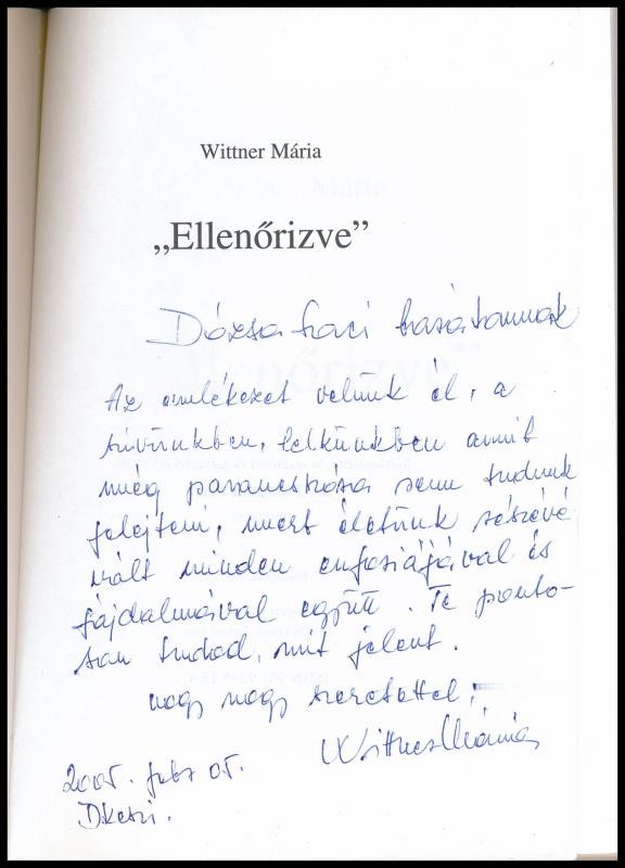 Description: Wittner Mária: "Ellenőrizve." Szerk., bevezetővel, és jegyzetekkel ellátta: Dr. Tamáska Péter. Bp., 2002., Magyar Ház. Kiadói papírkötés. A szerző által DEDIKÁLT, személyes hangvételű sorokkal.