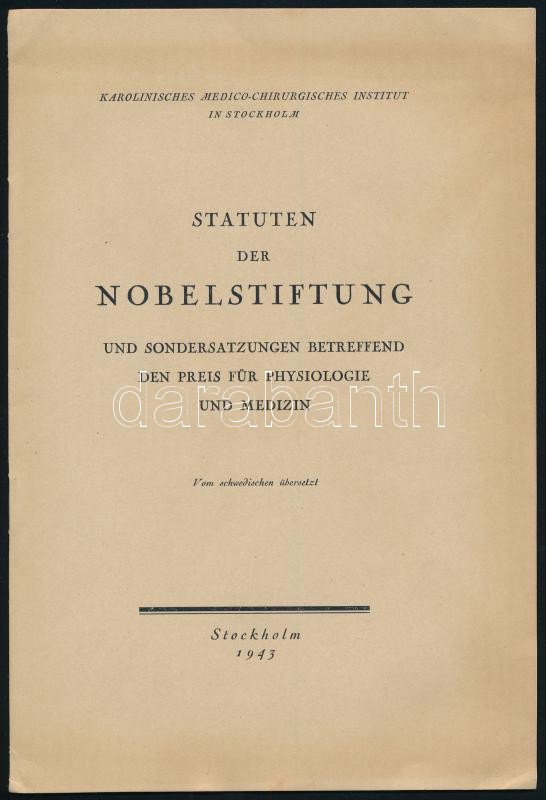 Description: Statuten der Nobelstiftung und Sondersatzungen betreffend den Preis für Physiologie und Medizin. Karolinisches Medico-Chirurgisches Institut in Stockholm. [A Nobel-alapítvány alapszabályzata, és az orvosi Nobel-díjra vonatkozó speciális szabályok. Karolinska Intézet, Stockholm.] Stockholm, 1943, Kungl. Boktryckeriet P. A. Norstedt & Söner, 14 p. Német nyelven. Kiadói tűzött papírkötés.