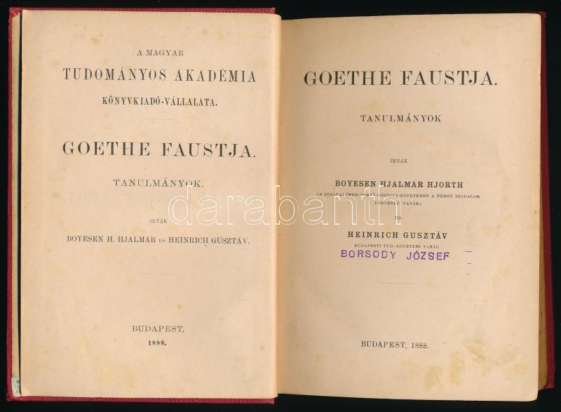 Boyesen, Hjalmar Hjorth - Heinrich Gusztáv: Goethe Faustja. Tanulmányo... https://www.darabanth.com/en/424-Online-auction/424.0/Books/Books-Other-rarities~2000022/Boyesen-Hjalmar-Hjorth-Heinrich-Gusztav-Goethe-Faustja-Tanulmanyok-Bp-1888-MTA-Konyvkiad~II2699029