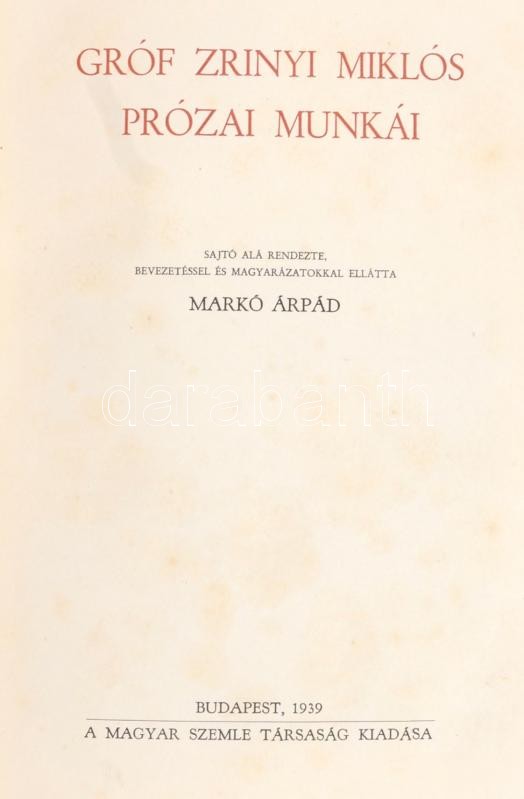 Gróf Zrínyi Miklós prózai munkái. Sajtó alá rendezte, bevezetéssel és magyarázatokkal ellátta: Markó Árpád. A Magyar Szemle Klasszikusai. Bp., 1939, Magyar Szemle Társaság, 378+(2) p. + 7 t. Kiadói aranyozott gerincű egészvászon-kötés, kissé kopottas, foltos borítóval, néhány foltos lappal, "M. kir. körmendi honvéd állomásparancsnokság" bélyegzővel.