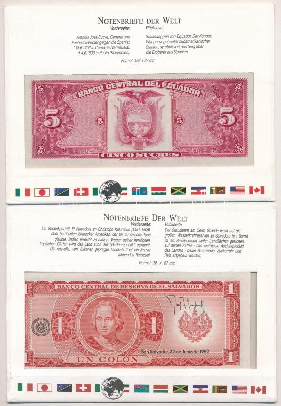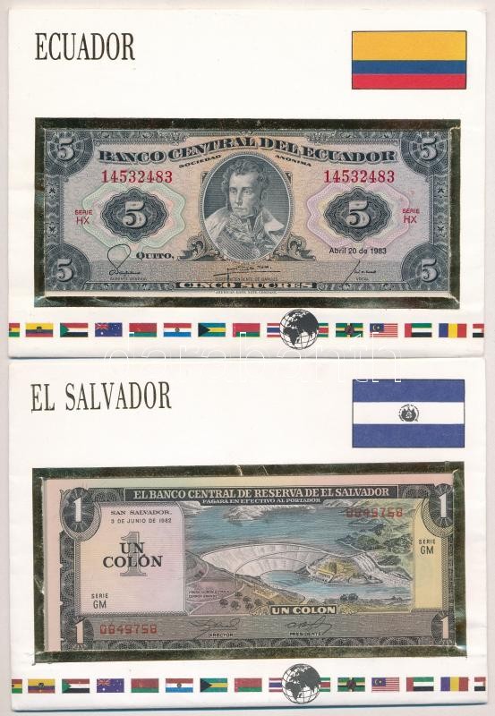 Description: Ecuador 1983. 5S + El Salvador 1982. 1C, mindkettő bankjegyes borítékban T:I