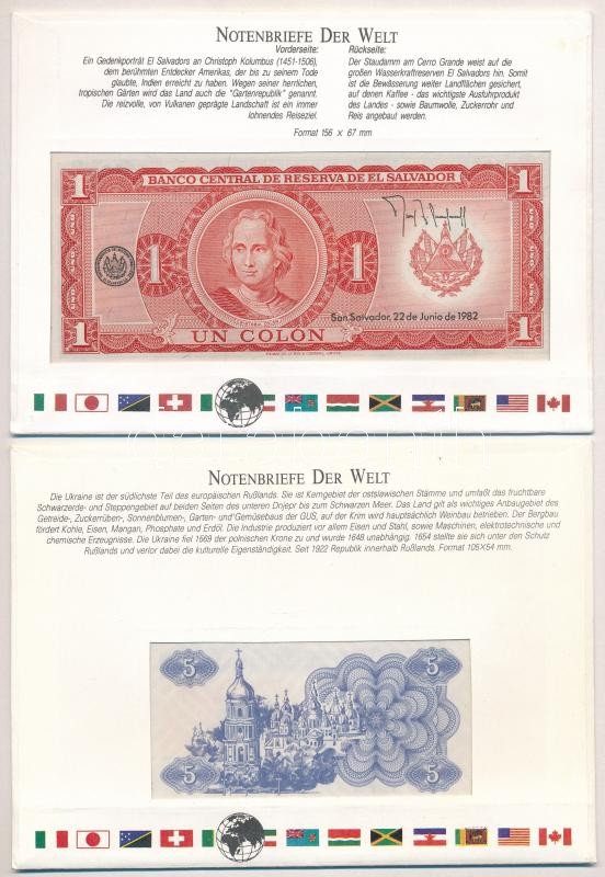 Description: El Salvador 1982. 1C + Ukrajna 1991. 5K, mindkettő bankjegyes borítékban T:I El Salvador 1982. 1 Colon + Ukraine 1991. 5 5 Karbovanets, both in banknote envelope C:UNC
