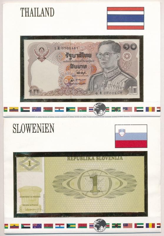 Thaiföld 1980. 10B + Szlovénia 1990-1991. 1T, mindkettő bankjegyes borítékban T:I