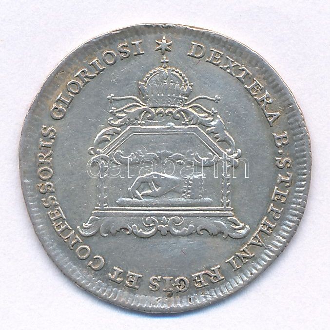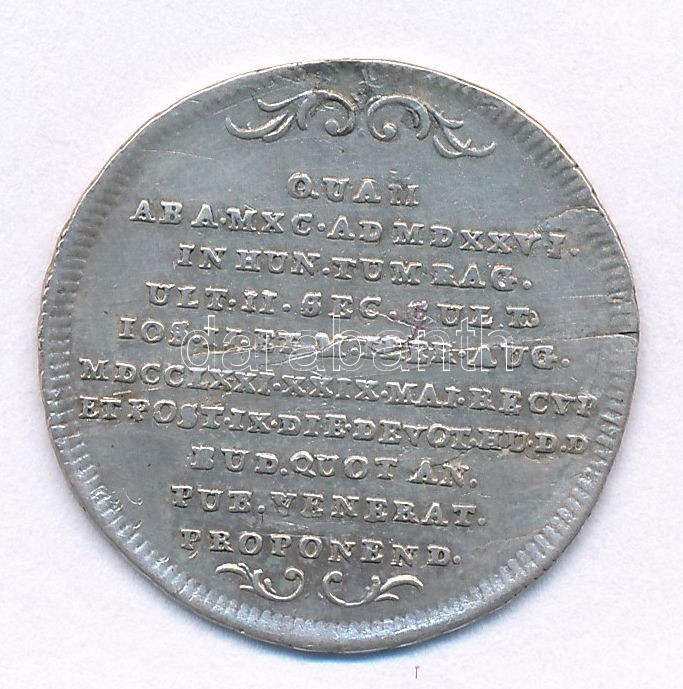 Habsburg Monarchy 1773. Commemorative Ag medallion of the transfer of the hand of Saint Stephan from Ragusa to Buda. "DEXTERA B STEPHANI REGIS ET CONFESSORIS GLORIOSI / QUAM - AB A. MXC. AD MDXXVI. - IN HUN. TUM RAG. - ULT. II. SEC. CULT. - IOS. II. ET M. THER. AVG. - MDCCLXXI. XXIX. MAI. RECVP - ET POST. IX. DIE. DEVOT. HU. D. D.- BUD. QUOT AN. - PUB. VENERAT. - PROPONEND." 3,82g/25mm) C:VF metal error, ear mark