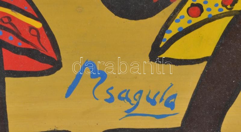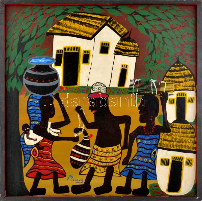 Damian B. Msagula tanzániai festő (1939-2005): Törzsi élet. Olaj, farost, jelzett, keretben, 60x60cm