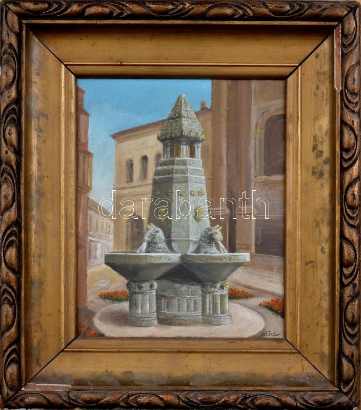Kiss Lajos (?-): Zsolnay-kút, Pécs. Olaj ,farost, jelzett. Dekoratív, sérült fakeretben.26,5x21 cm