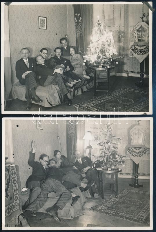 1930 karácsonya, Berlin: Keresztury Dezső író, későbbi vallás- és közoktatásügyi miniszter; felesége, Seiber Mária zongoraművésznő; Gombosi Ottó zenetörténész, zenekritikus; Kerényi György zeneszerző, népzenekutató, karnagy, később Bartók Béla és Kodály Zoltán munkatársa valamint Wernitz István, 2 db vintage fotó, egyik hátoldalán feliratozott, datált és albumba ragasztás nyomaival, 8,5x11,5 cm