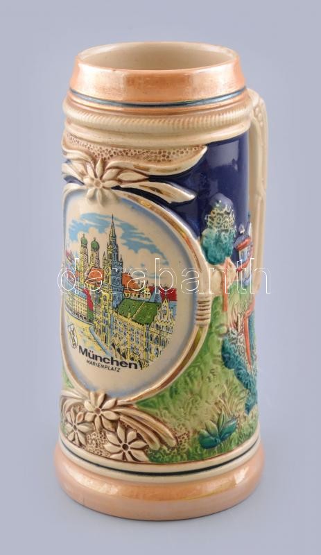 Müncheni városképes, nagyméretű német sörös korsó. Mázas kerámia, kézz...