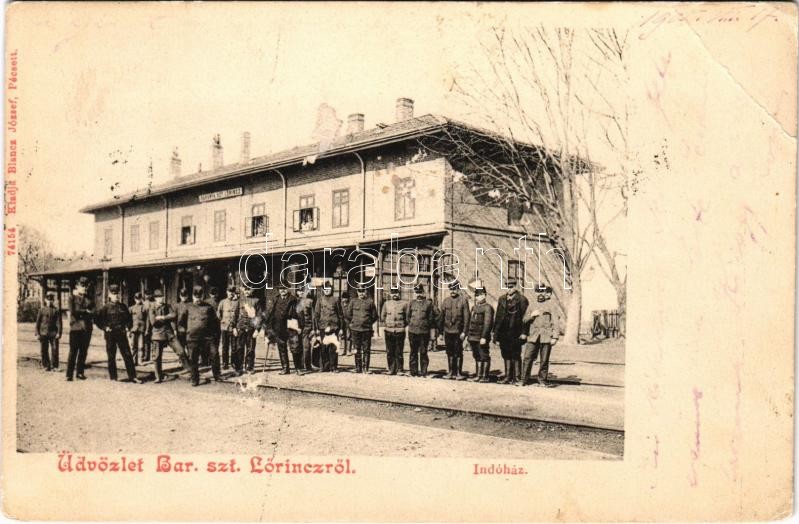 1905 Szentlőrinc, Baranya-Szt. Lőrinc, vasútállomás, vasutasok. Blancz József kiadása (EB)
