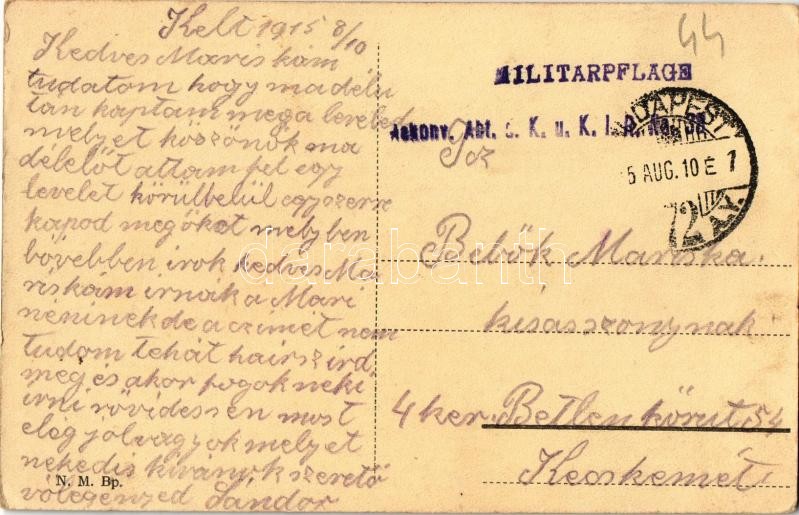 Description: 1915 Budapest XX. Pestszenterzsébet, Pesterzsébet, Erzsébetfalva; Kossuth Lajos utca, Római katolikus templom, üzletek, nyomda + "Militärpfläge Rekonv. Abt. K.u.K. I. R. No. 38." (EK)