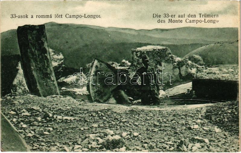Description: 33-asok a rommá lőtt Campo-Longon. A tiszta jövedelm az aradi 33-ik gyalogezred rokkantalapjáé / Die 33.er auf den Trümern des Monte Campo-Longo / WWI Austro-Hungarian military