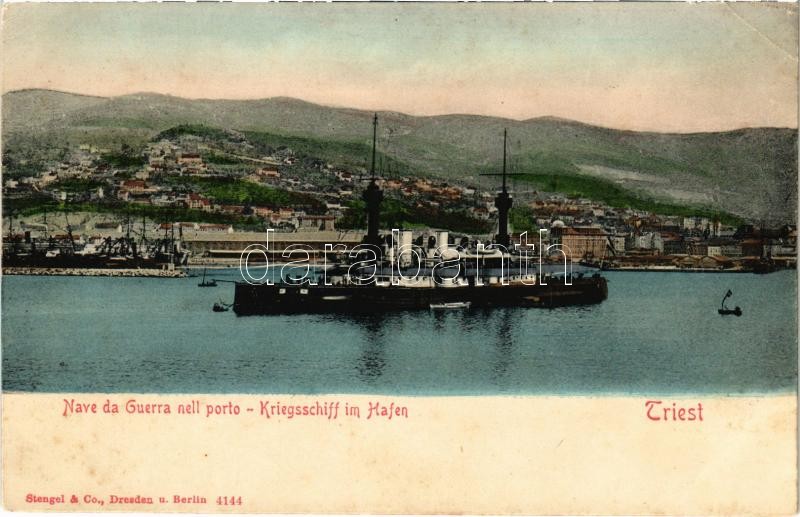 Description: Nave da Guerra nell porto / Kriegsschiff im Hafen. K.u.K. Kriegsmarine / SMS Mária Terézia az Osztrák-Magyar Haditengerészet páncélos cirkálója Trieszt kikötőjében / Austro-Hungarian Navy SMS Kaiserin und Königin Maria Theresia armored cruiser in the port of Trieste (EK)
