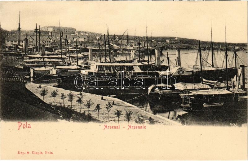 Pola, Pula; Osztrák-magyar hadihajók arzenálja a kikötőben / K.u.K. Kriegsmarine / Austro-Hungarian Navy warships' arsenal at the port. Dep. M. Clapis