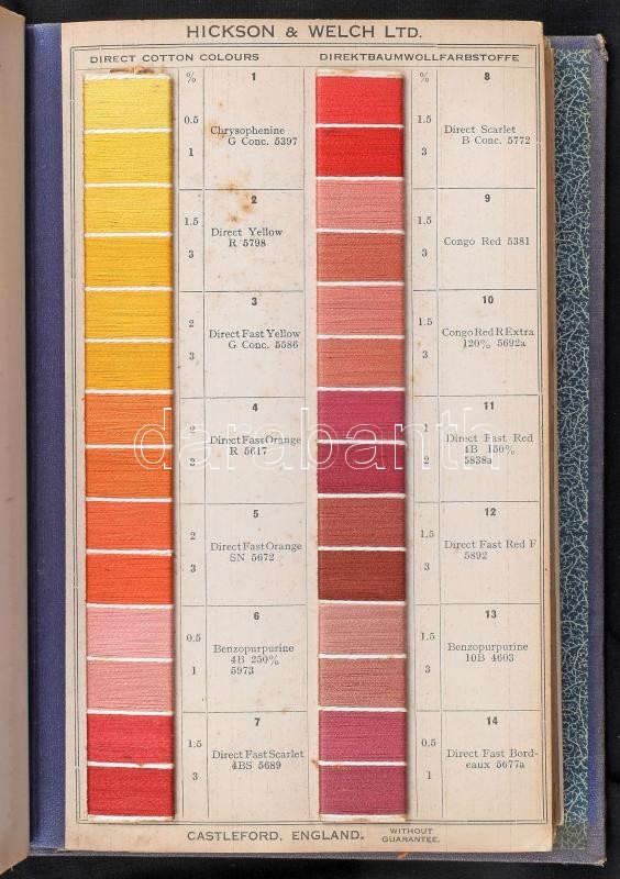 cca 1930-1940 Hickson & Welch Ltd. Castleford angol cérnafesték-gyár mintakatalógusa, sok termékmintával, korának megfelelő állapotban