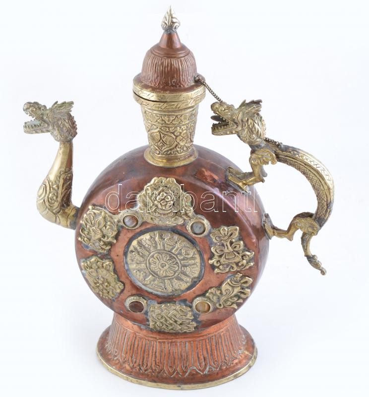 Antik tibeti sárkányos víz kiöntő, kőberakásokkal, réz. 1930 körül, korának megfelelő állapotban, m: 42 cm