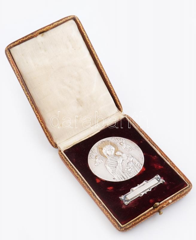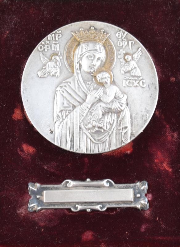 Ezüst (Ag) kegy ajándék. Mária, Jézussal, Aranyozott bőr tokban, névtá...