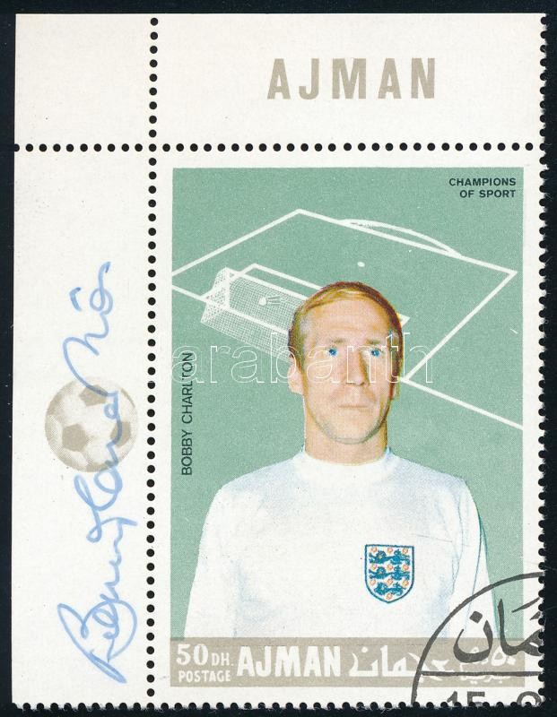 Bobby Charlton (1937-) világbajnok angol labdarúgó, autográf aláírása, őt ábrázoló bélyegen