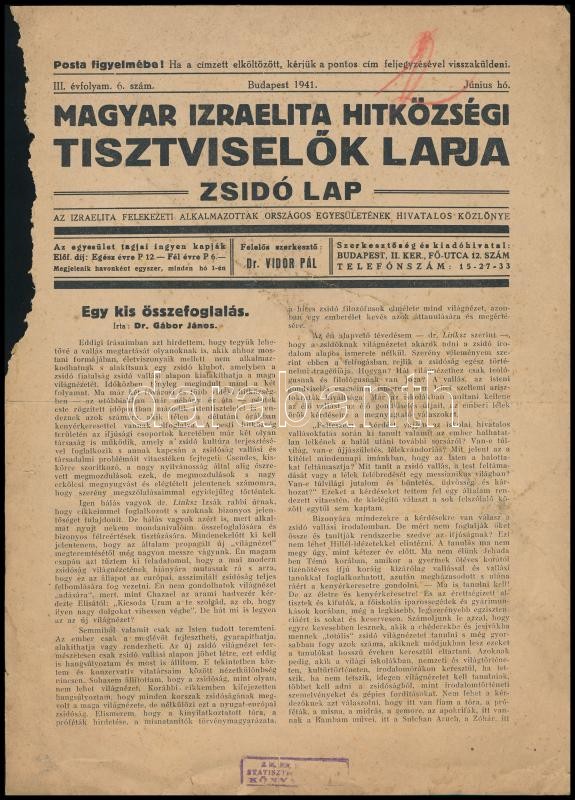 https://www.darabanth.com/en/425-Online-auction/425.0/Art-and-other-collectibles/Judaica~500027/1941-A-Magyar-Izraelita-Hitkozseg-Tisztviselok-Lapja-zsido-lap-III-evfolyamanak-6-szama-s~II2706276