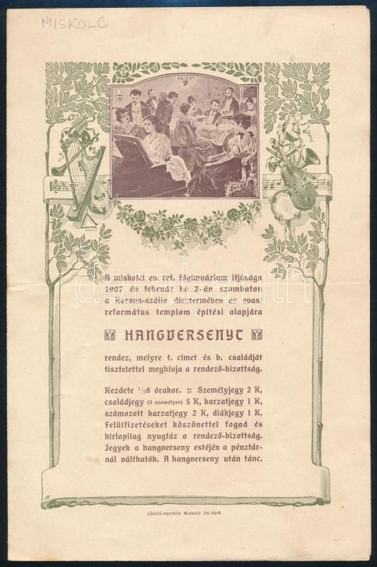 1907 A miskolci ev. ref. főgimnázium meghívója jótékonysági hangversen...