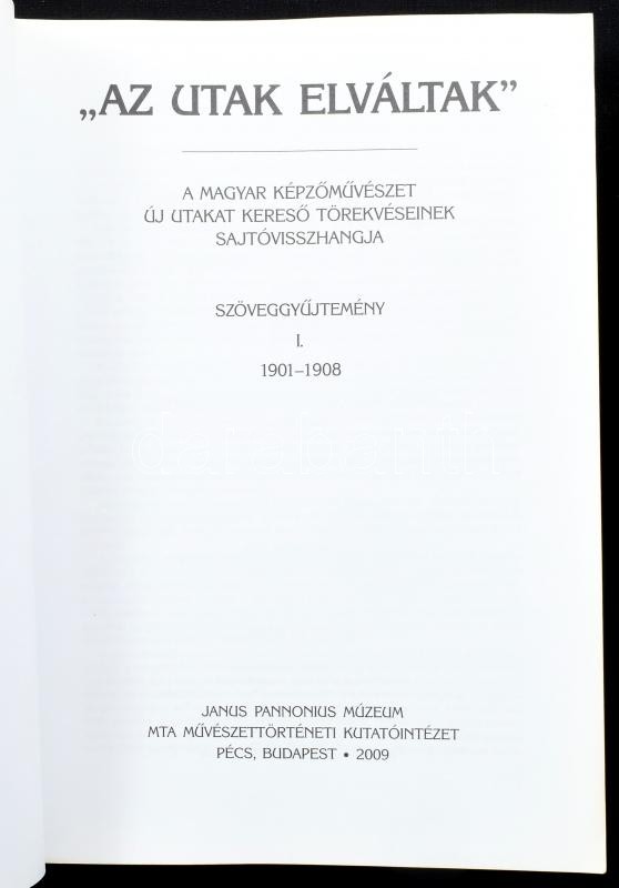 Description: "Az utak elváltak." A magyar képzőművészet új utakat kereső törekvéseinek sajtóvisszhangja. Szöveggyűjtemény I-II. köt. I. köt.: 1901-1908. II. köt.: 1909-1910. Gyűjtötte, vál., szerk. és a névmutatót készítette. Pécs-Bp., 2009., MTA Művészettörténeti Kutatóintézet. Kiadói papírkötések, az I. kötet borítójának alsó sarka foltos.