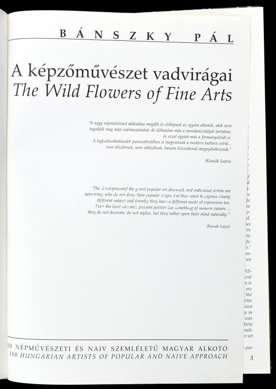 Bánszky Pál: A képzőművészet vadvirágai. 100 népművészeti és naiv szemléletű magyar alkotó. / The Wild Flowers of Fine Arts. 100 Hungarian Artists of Popular and Naive Approach. Kecskemét, 1997, szerzői magánkiadás. Gazdag képanyaggal illusztrálva. Magyar és angol nyelven. Kiadói kartonált papírkötés. Megjelent 3000 példányban. A szerző által DEDIKÁLT példány. / In English and Hungarian language. Signed by the author.