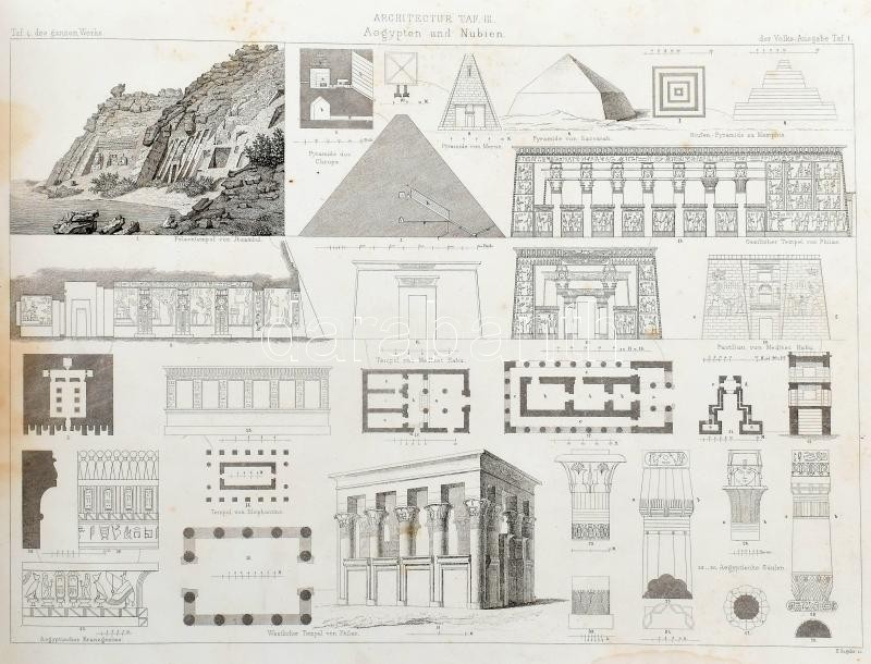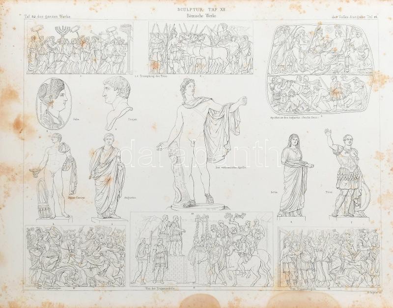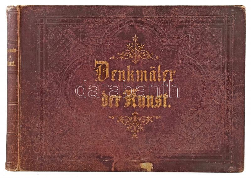 Lübke, Wilhelm: Denkmäler der Kunst. Zur Übersicht des Entwicklungsganges der bildenden Künste, von den frühesten Werken bis auf die neuere Zeit. Stuttgart, 1864, Ebner & Seubert, IV+56 p. + 56 t. (fekete-fehér képtáblák). Gazdag képanyaggal illusztrálva. Német nyelven. Kiadói aranyozott, dombornyomott, harántalakú egészvászon-kötés, kopottas, kissé sérült borítóval, foltos lapokkal.