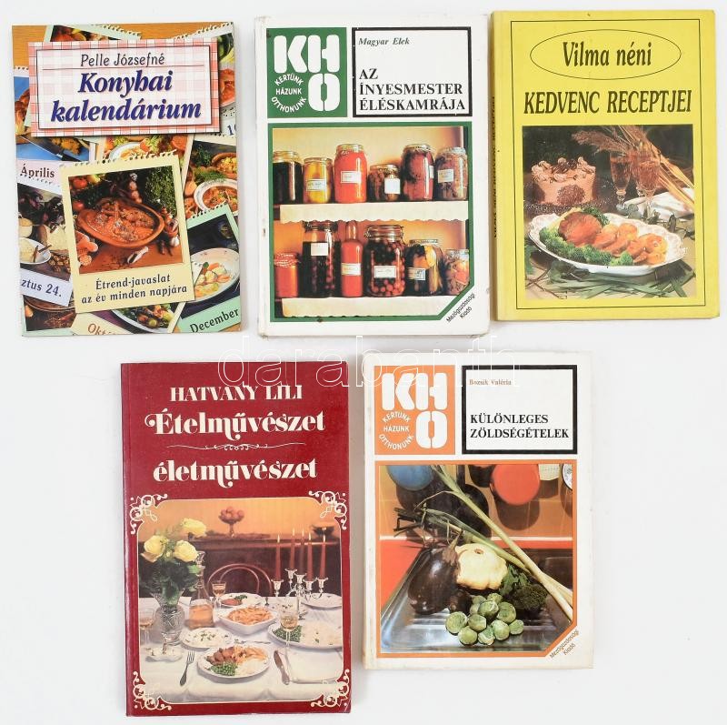 Description: 5 db szakácskönyv: Magyar Elek: Az ínyesmester éléskamrája; Bozsik Valéria: Különleges zöldségételek; Hatvany Lili: Ételművészet - életművészet; Pelle Józsefné: Konyhai kalendárium; Vilma néni kedvenc receptjei.