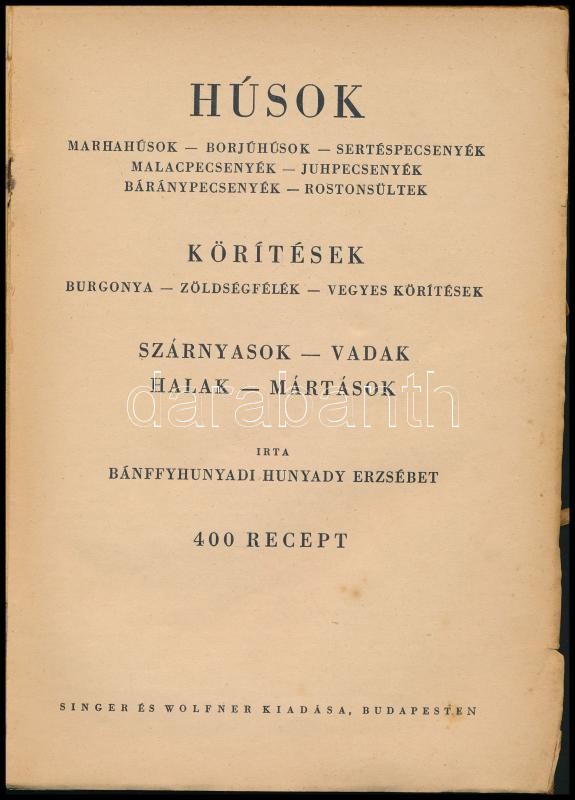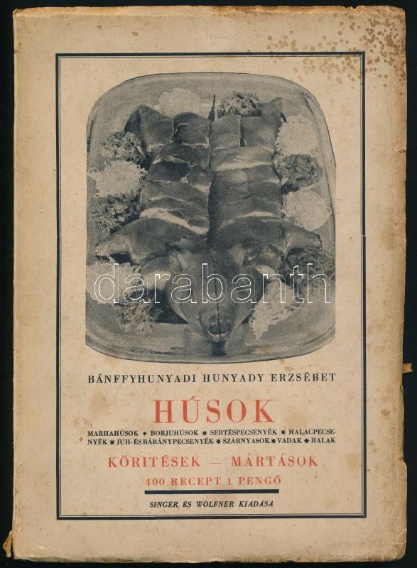 Bánffyhunyadi Hunyadi Erzsébet: Húsok. Marhahúsok, borjuhúsok, sertéspecsenyék, malacpecsenyék, juhpecsenyék, báránypecsenyék,rostonsültek. Körítések. Burgonya, zöldségfélék, vegyes körítések. Szárnyasok,vadak, halak, mártások. 400 recept. Bp.,én.,Singer és Wolfner. Kiadói papírkötés, kissé foltos, szakadt borítóval, szakadt címlappal.