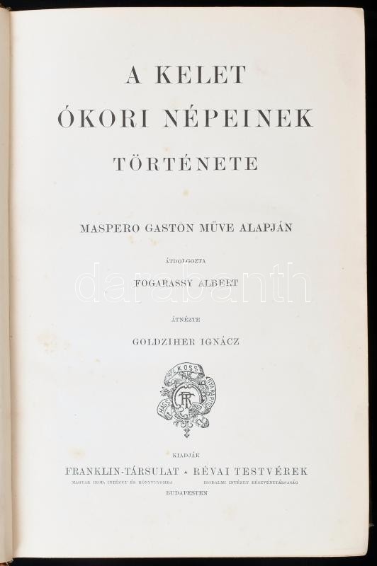 [Maspero, Gaston-Camille-Charles (1846-1916)]: A kelet ókori népeinek története. Maspero Gaston műve alapján átdolgozta: Fogarassy Albert. Nagy Képes Világtörténet I. köt. Szerk.: Marczali Henrik. Bp., é.n., Franklin-Társulat. Számos szövegközi és egészoldalas illusztrációval. Kiadói aranyozott gerincű félbőr-kötés, Gottermayer-kötés, márványozott lapélekkel, a borítón kis sérülésekkel, kopottas gerinccel, helyenként kissé foltos lapokkal.