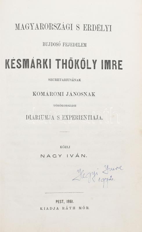 Description: Nagy Iván: Magyarországi s erdélyi bujdosó fejedelem Késmárki Thököly Imre secretariusának Komáromi Jánosnak törökországi diariumja s experientiaja. Pest, 1861, Ráth Mór. Bordázott gerincű félbőr kötés, tulajdonosi bejegyzéssel, kopottas állapotban.