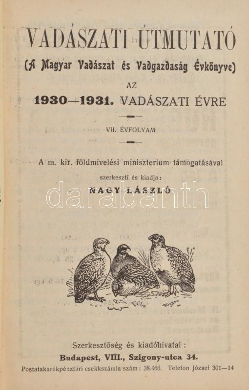 Nagy László: Vadászati útmutató (A Magyar Vadászat és Vadgazdaság Évkö... https://www.darabanth.com/en/425-Online-auction/425.0/Books/Books-Hunting~1000014/Nagy-Laszlo-Vadaszati-utmutato-A-Magyar-Vadaszat-es-Vadgazdasag-Evkonyve-az-1930-1931-~II2707138