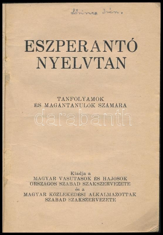 Eszperantó nyelvtan. Tanfolyamok és magántanulók számára. Kiadja a Mag... https://www.darabanth.com/en/425-Online-auction/425.0/Books/Books-Other-rarities~1000023/Eszperanto-nyelvtan-Tanfolyamok-es-magantanulok-szamara-Kiadja-a-Magyar-Vasutasok-es-Hajos~II2704319