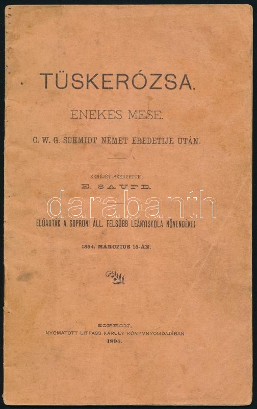 Tüskerózsa. Énekes mese. C. W. G. Schmidt német eredetije után. Sopron, 1894, Litfass Károly. Kiadói papírkötés, kopottas állapotban.