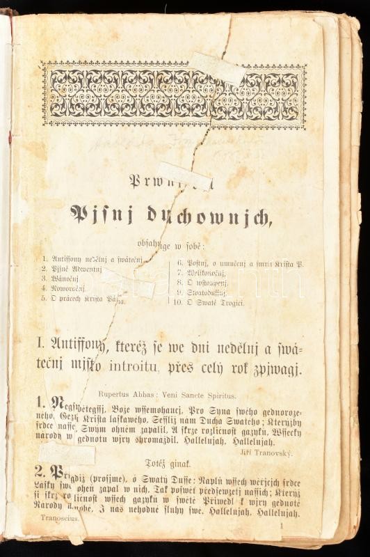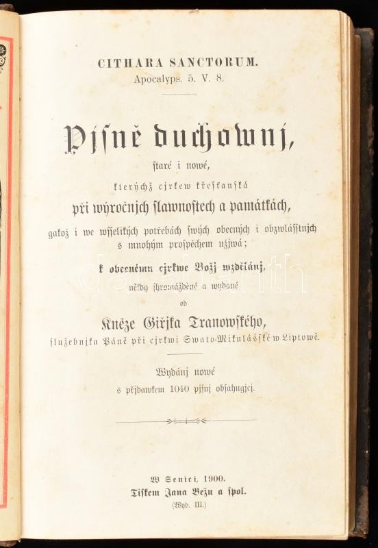 [Třanovský, Jiří (1597-1637):] Cithara sanctorum. Pjsně Duchownj, Staré y nowé, kterýchž Cyrkew Křestanská při Wýročnjch Slawnostech a Památkách,... ; Hozzákötve: Přjdawek pronikawych nowych, y nekterych starých pjsnj...; Hozzákötve: Phiala sanctorum. Modlitby nábozné ze Swatého. Pjsma wybrané,... W Pessti [Pest], 1868., Alojza Bucánskyho (Bucsánszky Alajos), XVI+1247;112; 237+1 p. Szlovák nyelven. Korabeli egészbőr-kötés, kopott, foltos borítóval, kissé foltos lapokkal, egy helyen kissé sérült kötéssel, az elülső tábla belsején a papírborítás sérült, az elülső szennylap hiányzik, a hátsó szennylap sérült, egy lap hiányzik, bejegyzésekkel.; [Třanovský, Jiří (1597-1637):] Cithara sanctorum. Pjsně Duchownj, Staré y nowé, ... Hozzákötve: Phiala Sanctorum. Modlitby nábozné ze Swatého. Pjsma wybrané,... W Senici [Szenice/Senica/Senitz],1900., Tiskem Jana Bežu [Jana Beza], 1 t.+VI+1261 [kéthasábos számozás]+104 [kéthasábos számozás] p. Szlovák nyelven. Korabeli kopott, foltos egészbőr-kötésben.; [Třanovský, Jiří (1597-1637): Cithara sanctorum. Pjsně Duchownj,...] Hozzákötve: Phiala Sanctorum. Modlitby nábozné ze Swatého. Pjsma wybrané,... Hozzákötve: Přjdawek pronikawych nowych, y nekterych starých pjsnj... W Senici [Szenice/Senica/Senitz],1895., Tiskem Jana Bežu [Jana Beza], 1-1261 [Kéthasábos számozás]+155+1-32,49-59, 61-104 p. Szlovák nyelven. Korabeli egészbőr-kötésben, kopott borítóval, hiányzó és kijáró lapokkal.