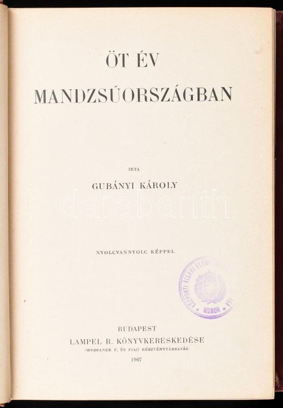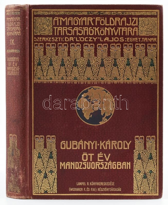 Gubányi Károly (1867-1935): Öt év Mandzsuországban. Lóczy Lajos előszavával. Magyar Földrajzi Társaság könyvtára. Bp.,é.n.(1906), Lampel R. (Wodianer F. és Fiai), VII+327 p.+16 (egészoldalas fekete-fehér fotók) t. Szövegközti fekete-fehér fotókkal illusztrált. Kiadói dúsan aranyozott egészvászon sorozatkötésben, Gerincen kis kopással, egyébként szép állapotban