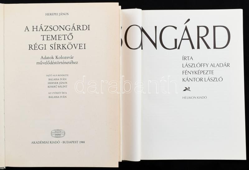 Lászlóffy Aladár - Kántor László: Házsongárd. Bp., 1989, Helikon. Fekete-fehér fotókkal illusztrált. Kiadói kartonált papírkötés, kiadói papír védőborítóban. + Herepei János: A házsongárdi temető régi sírkövei. Bp., 1988, Akadémiai Kiadó. Kiadói egészvászon-kötés, kiadói papír védőborítóban.