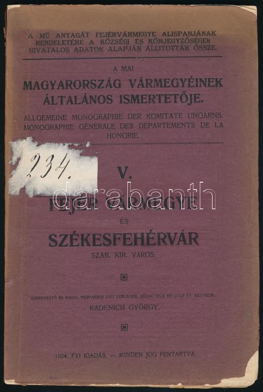 Description: Radenich György (szerk.): Fejér vármegye és Székesfehérvár szab. kir. város. A mai Magyarország vármegyéinek általános ismertetője V. 1924. Kiadói szakadt papírborító, kopottas állapotban.